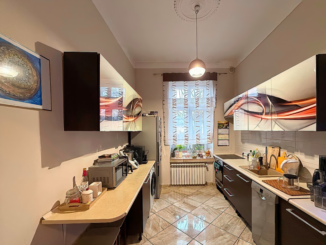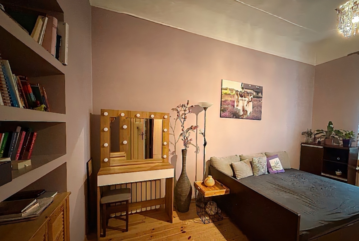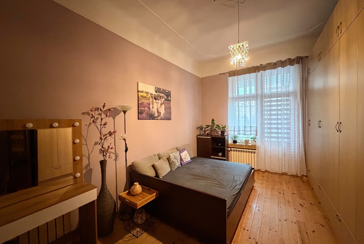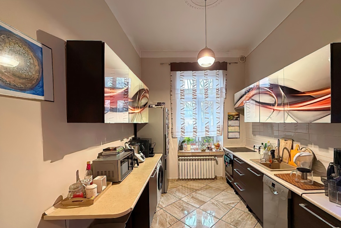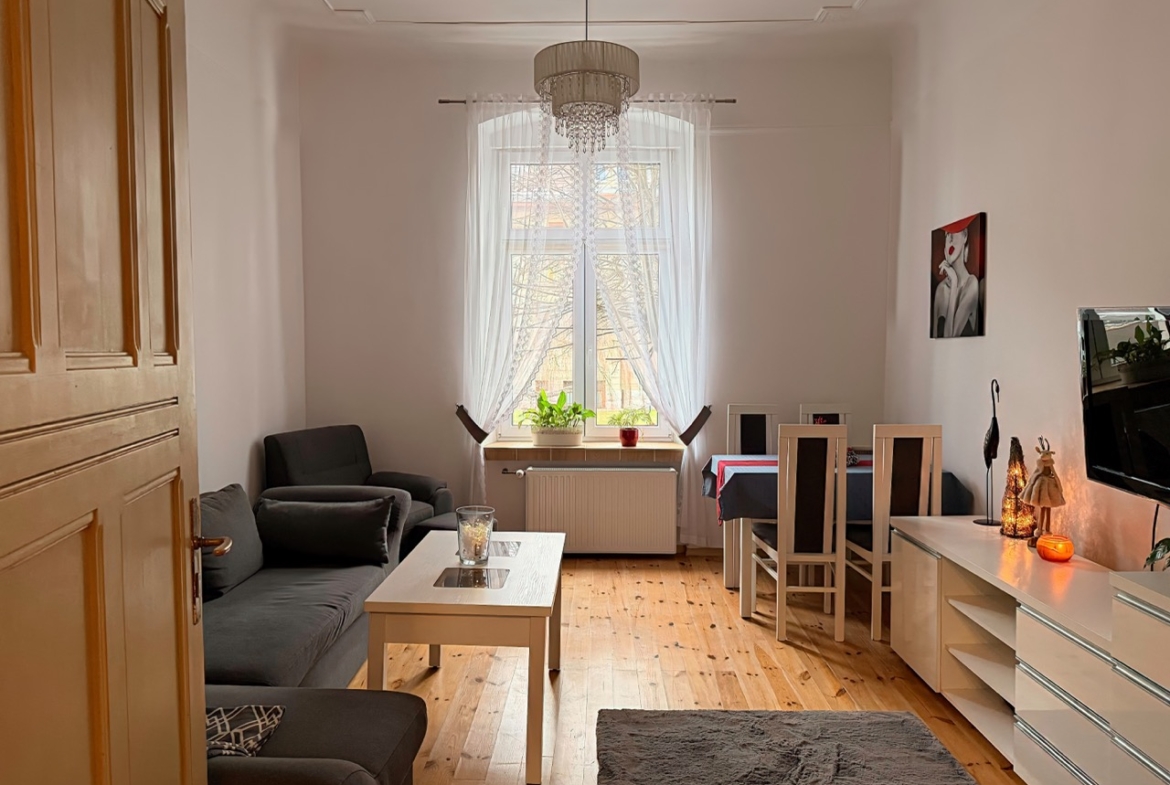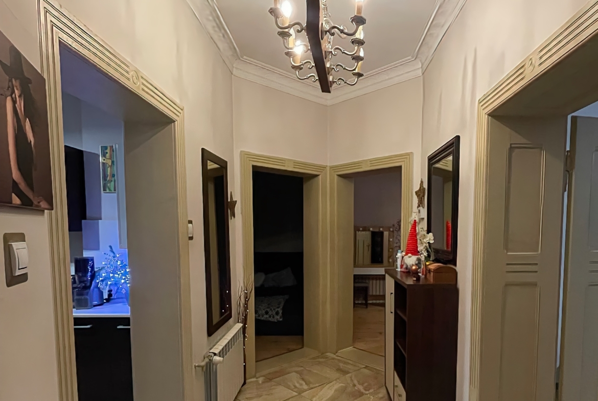 Trzy ustawne pokoje (jeden z wyjściem na balkon), oddzielna kuchnia oraz łazienka z oknem. Zachowane oryginalne drzwi wewnętrzne wraz z ościeżnicami oraz sztukateria . Mieszkanie wyposażone jest w ogrzewanie gazowe z nowym piecem dwufunkcyjnym . Duża piwnica oraz możliwość korzystania ze wspólnego strychu.